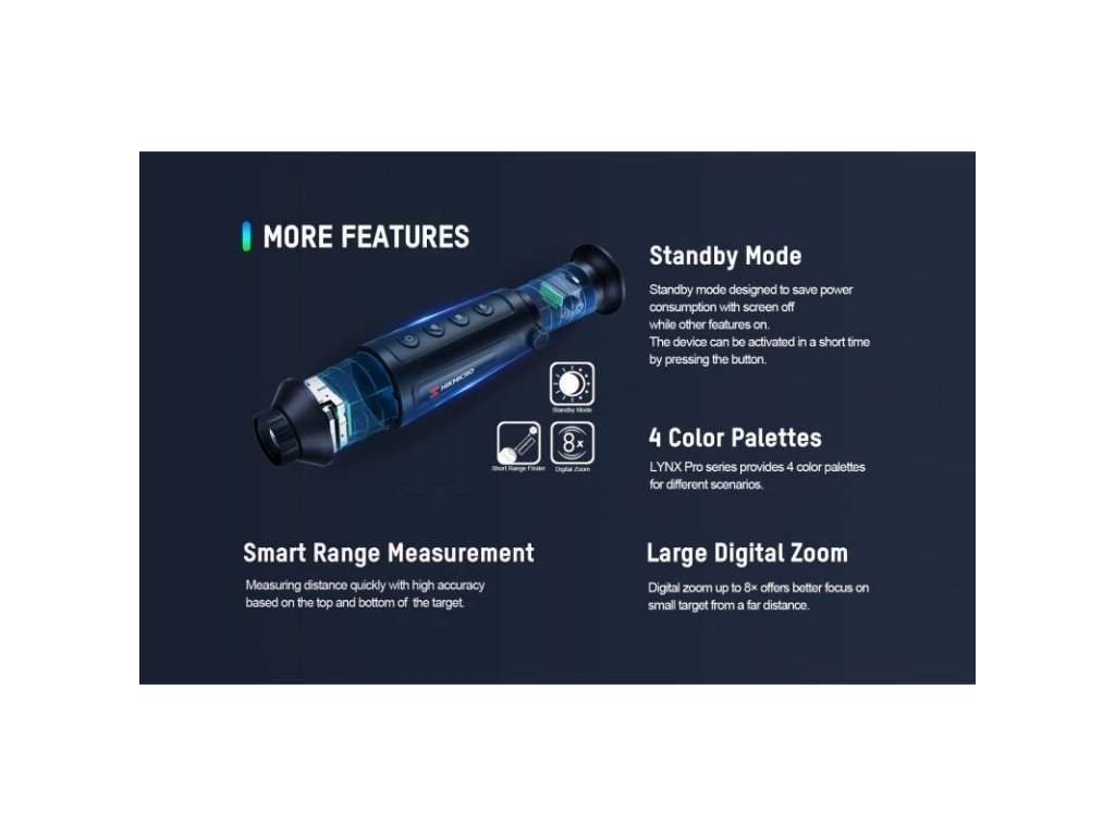 Termovízna kamera HIKMICRO LYNX PRO LH15 (HM-TS03-15XG/W-LH15) je vybavená kvalitným jadrom s rozlíšením 384 × 288 px. 12µm (12-mikrónová technológia) a novým displejom LCOS s rozlíšením 1280 × 960 px, 15 mm šošovkou a 8x digitálnym zoomom.